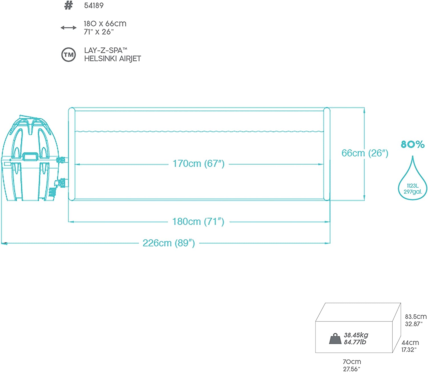 - Water Capacity (80%): 1,123 L (297 gal.)